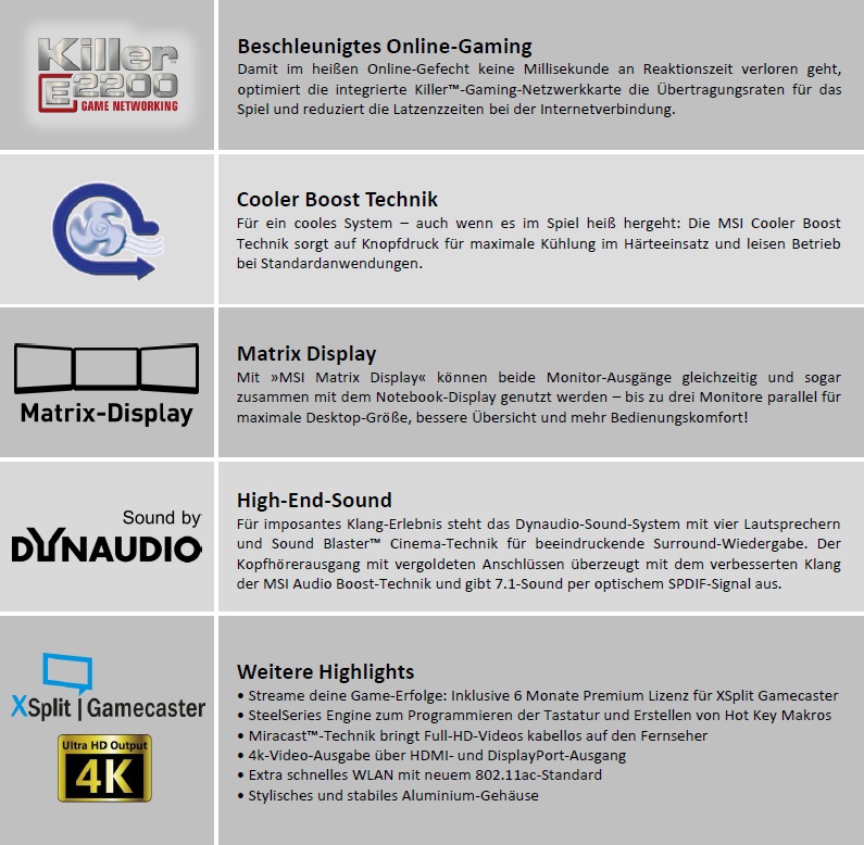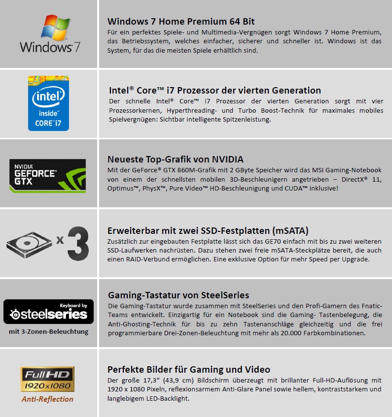 Bevor ich näher auf das Notebook eingehe, hier erstmal eine Auflistung der Leistungsmerkmale und Features des von mir getesteten MSI GE70 Apache Pro.