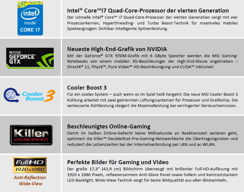 Mit der GeForce GTX 970M-Grafik mit 6 GByte Speicher werden die MSI Gaming-Notebooks von einem mobilen 3D-Beschleuniger der High-End-Klasse angetrieben – DirectX 11, PhysX, Pure Video HD-Beschleunigung und CUDA inklusive!