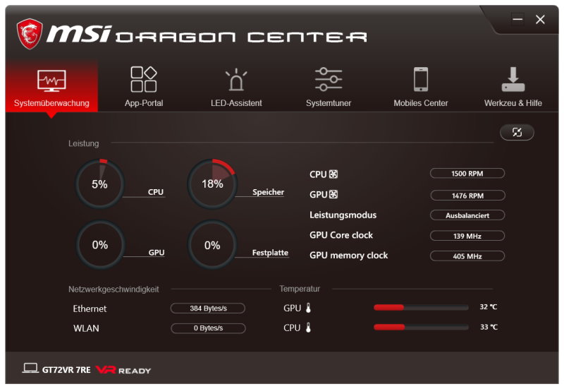 | Das Dragon Center von MSI bietet eine komfortable Möglichkeit das System zu überwachen, die Tastaturbeleuchtung einzustellen und